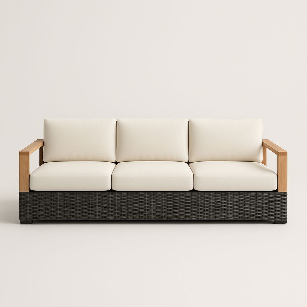 Kolor: Kremowe poduszki, Czarna podstawa, Dębowe podłokietniki.